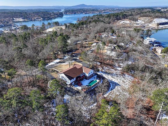 Custom-Built Ridgetop Home with Panoramic Views of W Mountain & Lake Hamilton Ridgetop home is positioned on approximately 1.5 acres and offers expansive views of West Mountain and Lake Hamilton from a quiet, elevated setting. The property combines privacy, flexible living space, and recent mechanical updates in a highly desirable Hot Springs location. The main living level features hardwood, ceramic tile, and LVP flooring, centered around a wood-burning fireplace with gas starter. The primary suite includes an updated bathroom with a modern walk-in shower. Two additional bedrooms are located in the east wing and share a Jack-and-Jill bathroom, creating an efficient and functional layout. Outdoor living areas are designed to take advantage of the ridge-top setting, with an expansive upper deck and a lower patio overlooking the surrounding landscape. A saltwater pool is located within a private, fenced area, creating a secluded outdoor retreat. Additional features include a 12x16 storage building with ramp access, electricity, window-unit air conditioning, a built-in work/storage table, and loft storage on three sides. New roof (2025),