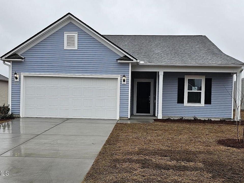 Welcome to luxury living with coastal charm at an affordable price in our Eagle Run Community! Close to golfing, marinas, breath-taking beaches and bustling small towns to explore- Meet our popular move-in ready 3 bedroom, 2 bath Compton model brand new home with ocean blue siding featuring a pristine open floor plan of over 1900 sq ft, lots of windows to let in that beautiful Carolina blue skies sunshine, combined with neutral flexible rooms/office/study with french doors, that will give you lots of space to sprawl and rooms to relax. The spacious owner's suite is decorated with a tray ceiling, large walk-in closet, and leads to a nice size bathroom with a tiled walk-in shower & bench, and double vanities - The welcoming kitchen with lots of white staggered 36'' cabinets, island, granite countertops, several pantries/closets and stainless-steel appliances is perfect for the chef, baker or entertaining! Begin and/or end your day relaxing in the screened lanai with patio, while gazing at the peaceful pond or planning your future cocktail pool/jacuzzi as your irrigation system/ sprinklers freshens your grass. Wander over to the Pavilion and have a snack/read a book while overlooking the saltwater pool with Baja deck, or just sit on a bench overlooking the pond. Meet your friends for a game or two of pickle ball or enjoy a drink at the fire pit. All of our homes are Smart Homes providing top notch wireless service throughout. Enjoy built in pest control minimizing chemical exposure and maximizing effectiveness against pests! We include an exceptional 10yr Home Warranty with 5-year water infiltration and leak protection, as well as amazing additional incentives to help reduce costs and give you the excellent customer service that you deserve. Front photo is actual photo, while others are of a model home for representational purposes only and may show different options and upgrades selected. Our small community will include approx 300 homes when fully completed..