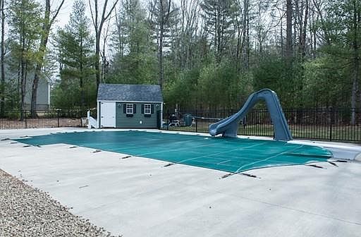 Beautiful well sought Colonial home in Hemlock Estates with 3 floors of living space First floor consists of open floor plan with kitchen flowing into dining and living room. Granite counters and hardwood everywhere. Recessed lighting and crown molding. Separate laundry room with utility sink and closet, 1/2 bath and separate office. The 2nd floor boasts a master bedroom with master bath, huge walk in closet with access to storage above the garage. There are 2 additional bedrooms with full bath and shower. 3rd floor offers 2 additional rooms which could be used as a family room/bonus room or could add closets for 2 additional bedrooms. Outside has wrought iron fenced in heated salt water pool with concrete deck and huge shed used for pool accessories/snowblower and lawn mower. Solar panels are located on the back of the house and there is a sprinkler system. Come see all this lovely home has to offer. Schedule your showing today!!
