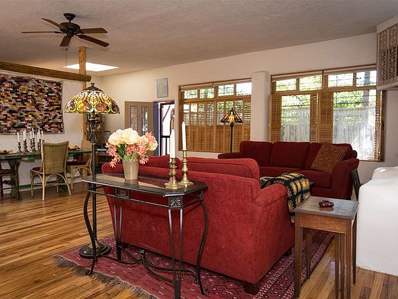 Quintessential Santa Fe charm in terrific location - close to everything yet on a short residential street. This one bedroom/one bath condo has generous living space, charming kitchen, open floorplan, and private outdoor area adjacent to common gardens. Wonderful fireplace is the heart of the home, making this a particularly cozy home in the upcoming cooler weather. Lovely wood and tile flooring, delightful wood and other architectural accents makes this unique and personal. Off-street parking space, plus on-street parking, close to the Railyard in the Guadalupe District.