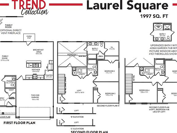 The Laurel Square, part of the Trend Collection by Ball Homes, is two story plan with a very open first floor layout. The island kitchen offers both a breakfast area and countertop dining, and a large pantry. Granite kitchen counter tops with stainless steel 50/50 under-mount sink and full back splash. Stainless steel appliances including smooth top range, microwave and dishwasher. The kitchen opens to the family room at the rear of the home. Upstairs are the primary bedroom suite, three bedrooms and a hall bath. The primary bedroom suite includes a bedroom with vaulted ceiling, large closet, and spacious bath with tub/shower, window, and linen storage. Raised vanities in baths and 12x10 concrete patio. Job# 121AA
