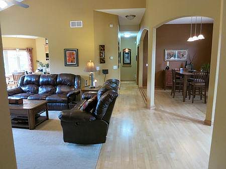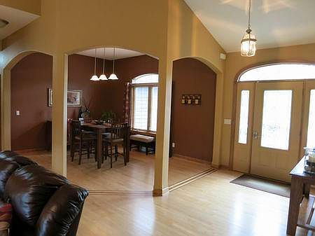 Stunning open concept split bedroom partially exposed basement ranch with lake access in The Pines Kitchen with breakfast bar, granite and SS appliances. Amazing lofty ceilings, archways, columns, staggered cabinetry, and walls of windows. Master suite with his/hers WIC's, whirlpool tub, double sinks, and large shower. Fully finished partially exposed lower level with 2 bedrooms, full bath, huge rec space and 3rd office/den. Two tiered deck overlooking private almost half acre lot with hot tub.