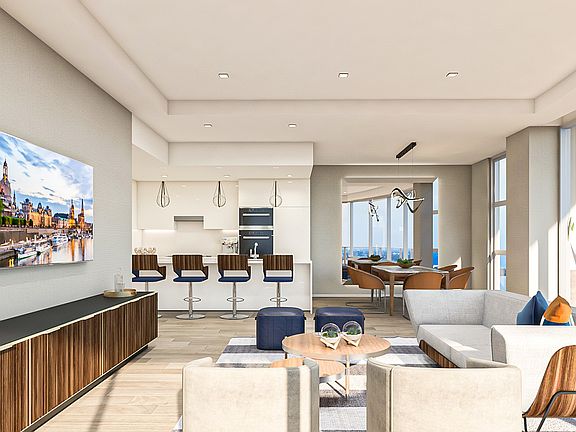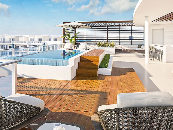 Our Penthouse floorplan is beautifully appointed with 12' ceilings and hurricane impact glass, European Oak Wood throughout, full Miele Appliance package, waterfall quartz kitchen island and countertops with European cabinetry, oversized owner's suite with large bathroom featuring freestanding air bathtub, Toto toilet & bidet. This private oasis includes a rooftop terrace with 360 degree views, plunge pool, summer kitchen, and pergola for entertaining.
