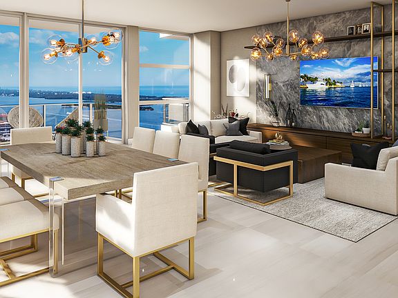 This flow-through three-bedroom floorplan is beautifully appointed with 10ft ceilings and hurricane impact glass, porcelain tile throughout, full Miele Appliance package, wine & beverage cooler, waterfall quartz kitchen island and countertops with European cabinetry, split-bedroom layout, den, oversized owner's suite with large bathroom featuring freestanding soaking tub, and two terraces with east water and west city views.