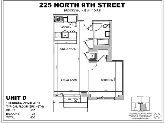Available for July 4 move in date *Sunny south facing 1BR with walk-in closet and private balcony* Broker Fee *225 North 9th Street #4D* - chef's style kitchen with peninsula and stainless steel appliances including a dishwasher and microwave - extra long open plan living room and dining room with access to the private balcony - marble tiled bathroom with soaking tub - spacious bedroom with walk-in closet - iPod dock with ceiling embedded speaker system and individual room volume control - HVAC units in all rooms with thermostat control - plank hardwood floors through - floor to ceiling windows throughout - WD hook-ups available