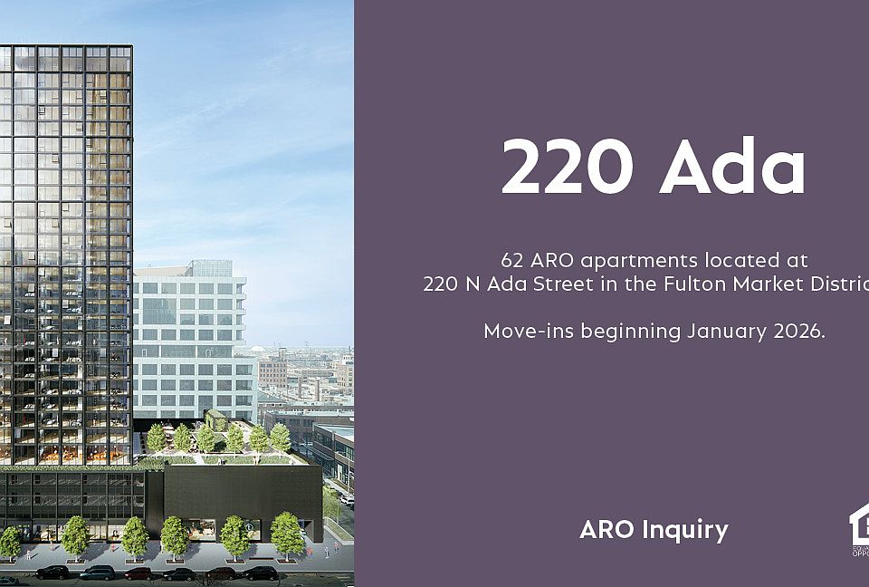 One-bedroom "Below Market Rate" rental units available at 220 N. Ada, Chicago, IL, with a maximum rent of $1,350 per month. Must be income eligible. Households must earn no more than the
