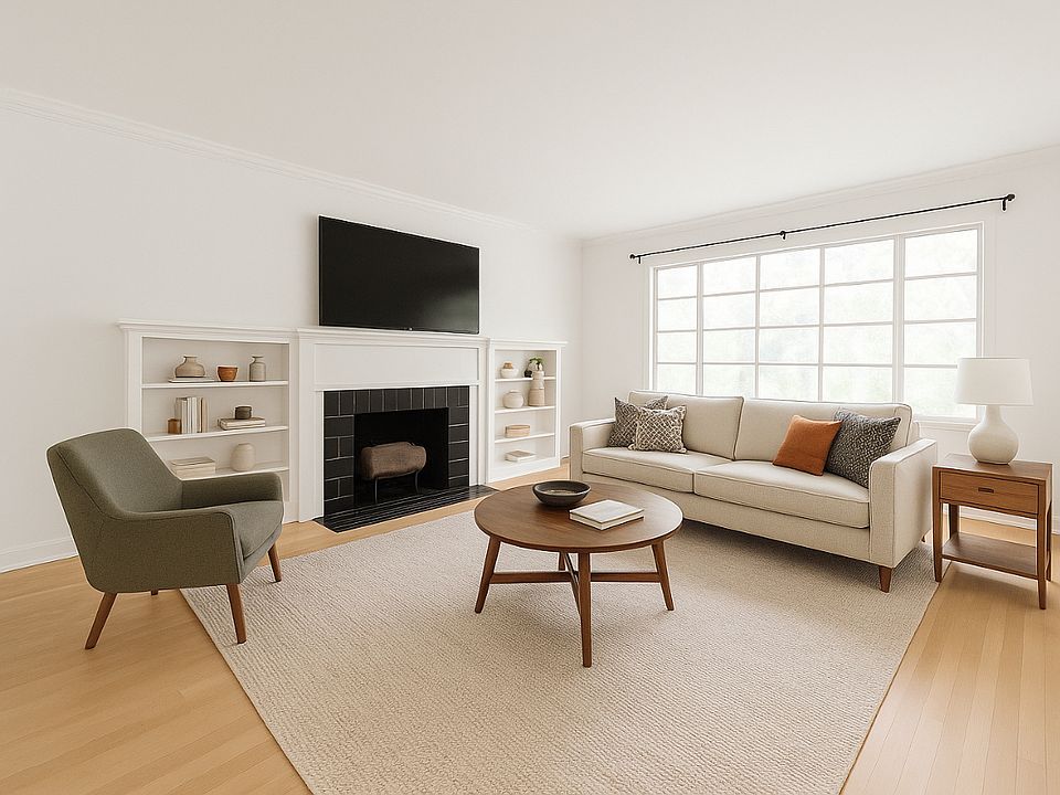 Open-concept living space with stylish furniture, a dedicated work area, and 65" 4k Smart TV