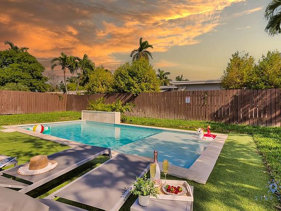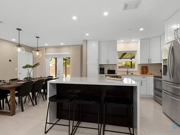 This South Florida luxury house is close to the shimmering Atlantic Ocean. The first room features a king-size bed, a closet, and a Smart TV. The second and third rooms each have two queen beds, closets, and Smart TVs. The house includes a shared full bath and a full master bath. The living area boasts a large sectional and a Smart TV. The kitchen is equipped with a large island with a cooktop, stainless steel appliances, a double oven, and spacious cabinetry, along with small appliances like a toaster and coffee maker. Basic cookware, cutlery, and pots and pans are provided. The dining table seats 8 guests, and the outdoor area includes a comfy seating area and grill. A full-size washer and dryer are available for your convenience.
