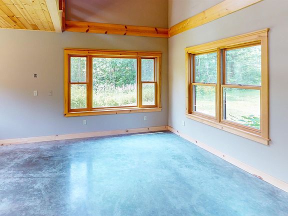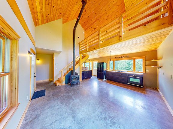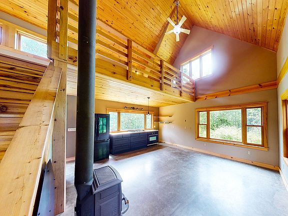- Description: Light and bright living room with large picture windows, cozy woodstove and vaulted ceiling