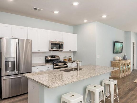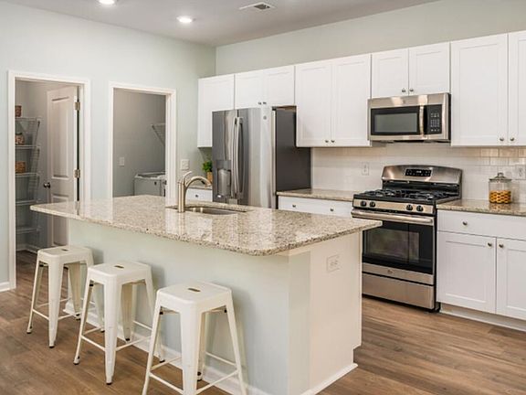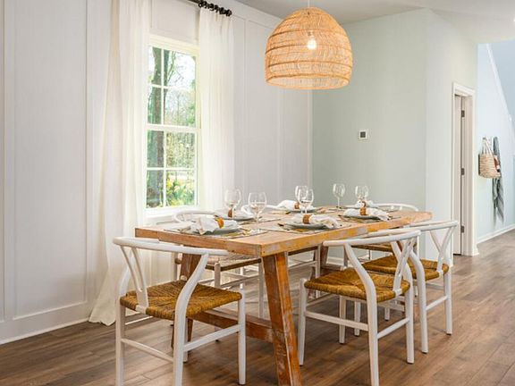 The Columbia is an open floorplan with a master on the first floor. The kitchen is accented with a large center island with plenty of counter space. The cabinets are white with beautiful granite countertops. The main space has vinyl downstairs, and carpet in the bedrooms. The family room is spacious and overlooks the backyard space with a covered porch. The master overlooks the backyard with access to the main space of the home. The upstairs loft is spacious and has 4 bedrooms for a growing family.