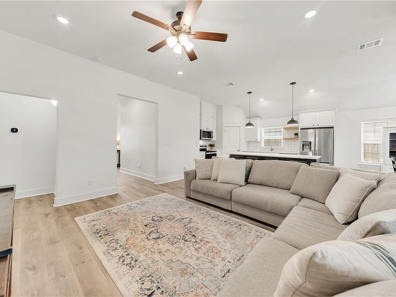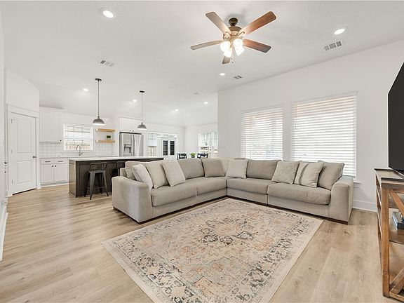 Adorable home in Grand Lakes subdivision! Home features a stately 8' solid wood entry door and a welcoming wide entry hallway. Wonderful split 3/2 layout, 2" blinds, tall ceilings have LED recessed lighting. Huge open concept living room can accommodate large furniture. Farmhouse black & white kitchen features an oversized island with counter-height seating for 4, a large walk-in pantry, and modern open shelving on the outside wall. Master retreat is located off the living room, master bath features large separate vanities, a soaking tub, frameless glass shower, and ample closet storage. 15'x15' back patio is enclosed on one side to provide privacy and a comfortable entertaining area, exterior TV conveys. Grand Lake HOA includes high-speed fiber internet. Short 10 min drive to Texas A&M, come see what makes this home so special!