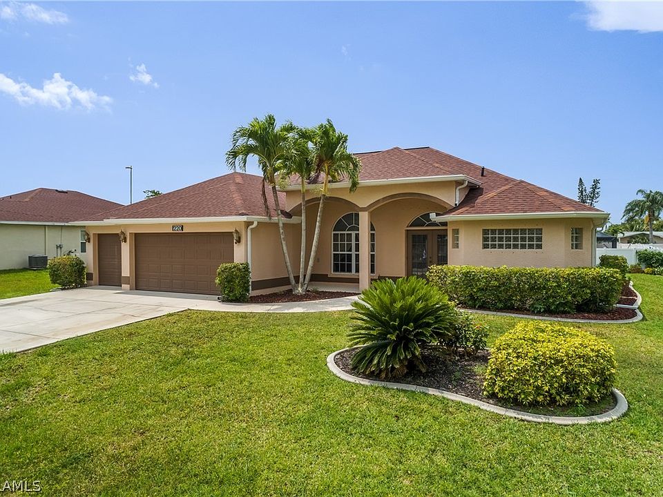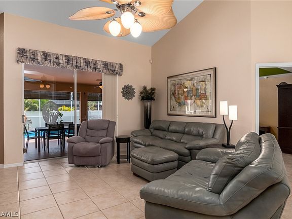 Exquisite 3-Bed, 2-Bath Pool Home in SE Cape Coral…Welcome to Your Dream Home - Discover the epitome of luxury and convenience in this stunning 3-bedroom, 2-bathroom pool home, ideally situated in the heart of Southeast Cape Coral, just moments from downtown. This gem boasts almost 2,000 sq. ft. of beautifully designed living space under air, perfectly complemented by an expansive 3-car garage. Step inside and be captivated by the open floor plan that exudes space and light. The vaulted ceilings and southern exposure create an airy, sun-drenched atmosphere throughout. Elegant tiles cover the floors of every room, and the built-in ceiling speakers provide an immersive audio experience, making this home perfect for entertaining or relaxing in style. The heart of this home is the gourmet kitchen, designed to delight any chef. It features 36-inch upper cabinets, sleek corian countertops, and all Stainless Steel appliances. The convenient breakfast bar is perfect for casual dining or morning coffee, while the open layout ensures you're never far from the action. Venture outside to your private oasis. The covered lanai is an entertainer's dream, offering ample space for gatherings, alfresco dining, or simply lounging by the pool. The heated pool, freshly resurfaced with new equipment and a newer heater, beckons you to take a dip and unwind. Thanks to the newly installed solar panels, you can enjoy a fixed electric bill, which is transferable to the new owner. Retreat to the luxurious primary suite, where comfort meets elegance. This spacious room easily accommodates a king-sized bed and a cozy sitting area. The primary en-suite bathroom is a sanctuary in itself, featuring a easy entrance shower, a jetted tub for ultimate relaxation, dual sinks, and a private water closet. The additional two guest rooms are generously sized and filled with natural light. The third bedroom, equipped with a Murphy bed, offers incredible flexibility – perfect for guests, a home office, or a hobby room. Whatever your needs, this home adapts seamlessly. Pet-Friendly and Practical - For pet lovers, the fenced dog run is a delightful addition, ensuring your furry friends are safe and happy. Practical features include new gutters and the peace of mind knowing that all assessments are paid. A Rare Find - Homes like this are a rare find in Cape Coral. From its prime location to its array of high-end features and thoughtful design, this property offers a lifestyle of comfort, convenience, and luxury. Whether you're lounging by the pool, cooking in your gourmet kitchen, or enjoying a quiet evening in your elegant master suite, every moment in this home is a joy. Don't Miss Out! Seize the opportunity to own this exceptional property. Schedule your private showing today and experience firsthand what makes this home a true standout. Your dream home awaits in beautiful Southeast Cape Coral – a place where every day feels like a vacation.