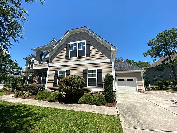Virtual Tour on YouTube: https://youtu.be/cS5-bCjfcxg [NOTE: "Zestimte" is based on 2013 planned construction of 3200 sq. ft. house without a 3rd attached garage. The ground level picture is of the lot.] This two-story, 3,664 sq. ft., ten-room home is uniquely designed on a .43-acre corner lot in a small, quiet neighborhood called Queens Harbor, just outside the Swansboro city limits in Onslow County, NC. There are five bedrooms and three full baths, with a guest suite on the first floor. The first floor has hardwood flooring with a formal dining room and coffered ceiling, living room with arched doorways, a family room open to the kitchen and café area. The kitchen has custom cabinetry, step-in pantry, and large granite top bar with pendant lighting. Upstairs, the loft area is hardwood flooring, and carpet in the bedrooms and the bonus room. Three of the upstairs bed rooms have vaulted ceilings. The master bedroom has a double trey ceiling and a vaulted master bathroom with dual sinks, walk-in shower, and tub. The master bedroom closet is oversized with access to the wash/dryer room. The home is constructed with Hardiplank siding, accent shakes, architectural stone, and a 30-year rated asphalt roof with guttering system. The property is professionally landscaped with a drip watering system front and back for the flower beds, providing privacy for a spacious backyard and a 420 sq. ft. deck and patio for outdoor living. There is an additional third car garage with outside entry and extended parking area. Swansboro is located between Jacksonville, NC and Morehead City, NC in an area called the Southern Outer Banks. The subdivision is located on Queens Creek, providing day-dock access and a shelter area exclusively for property owners. The Elementary, Middle, and High School complex for Swansboro is within 1.5 miles, and marinas and boat ramps are within 4 miles with access to the Intracoastal Waterway. The oceanfront and Emerald Isle are within 8 miles with additional boat ramps, marinas, and large public access parking and facilities. The back gate to the Marine Corps Base, Camp Lejeune is a 6.5-mile commute.