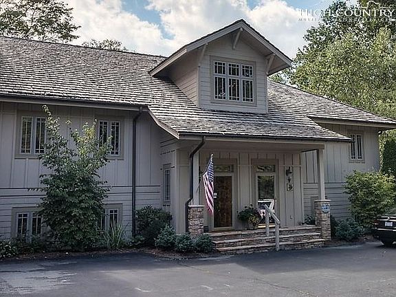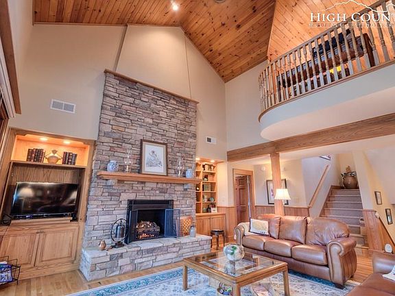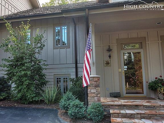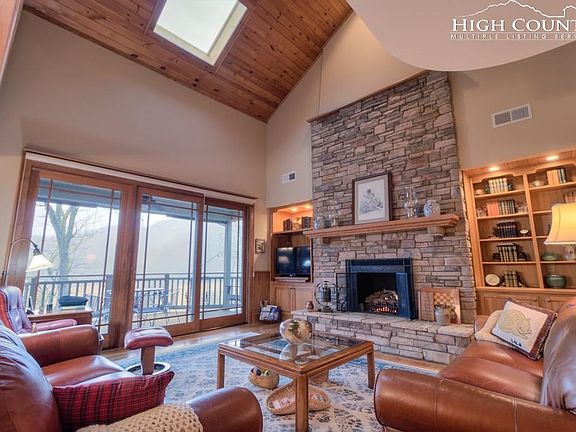 Spacious luxury condo with fantastic view of Grandfather Mountain near Hound Ears in Foscoe. This home features an open design with wood floors throughout, a deck along the entire side of the home, and tons of natural light. Listen to the sounds of the Watauga River below. Quality is evident with solid wood doors and steel beam construction. Large living room features a floor to ceiling stone fireplace and is open to a spacious dining area and kitchen with a breakfast bar as well as the large deck. Kitchen features granite counters and stainless steel appliances. Laundry and storage is off of kitchen. The master suite opens to the deck and has true his and hers closets and sinks, jetted tub and large shower. Second bedroom is on other side of the home with its own bath. Upstairs is a small loft and another bed with its own bath. Several closets upstairs for storage. The home has two HVAC units and 2 hot water heaters. Electric stair from foyer to main floor, then single level living if desired. There is also a garage in a separate building. Well managed POA, and building was painted in 2017. This combination of quality, space and view in a condo is unparalleled. Offered furnished.