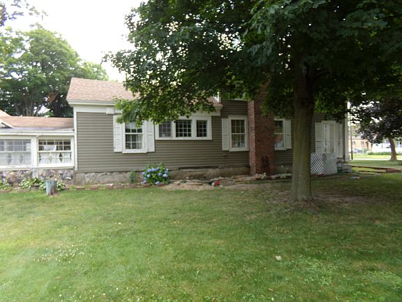 This home is a historic home built in 1845. Home features 4+ bedrooms, 2.5 baths. Many rooms, many closets. Some Mahogany walls,beams and trim.Main floor laundry.Large living room with built ins and fireplace,Formal Dining.Harwood floors in living room and dining room under carpet, Appliances stay with home including a water softener located under kitchen sink.Breezeway between house and garage. Front porch, corner lot. 2 Stall attached garage. Home in need of some TLC.