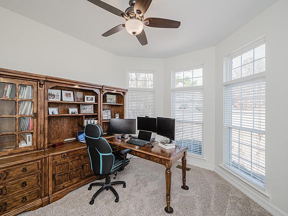 This stunning 6-bedroom, 4.5-bath home offers incredible space, comfort, and scenic views. A bonus room serves as a sixth bedroom, while three large living areas, a game room, and a billiard room provide endless entertainment options. The main-floor master suite features an oversized walk-in closet, and soaring ceilings throughout enhance the home's open airy feel. A private office or den, a large eat-in kitchen, and a formal dining area make everyday living and hosting effortless. Natural light fills the home, with large windows overlooking a wooded hillside with abundant wildlife. Recent updates include a new deck, fence, and leaf filter gutter system. The three-year-old roof ensures lasting durability, and a basement storm shelter offers added security. This home perfectly blends elegance, functionality, and nature. Call today to schedule a private tour of this beautiful home!