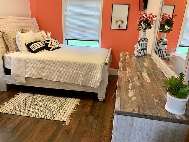 The master suite is an expansive dreamy home away from home with a specially procured rustic flooring, new king bedroom set and decor to make you feel like you've docked your yacht for the night.