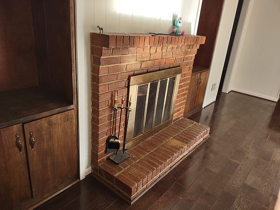 Sliding glass doors open up to a large backyard. Hardwood floors throughout. Tiled kitchen and dining area. Carpeted bedrooms. Fireplace. Two full baths. Washer and dryer hook up.