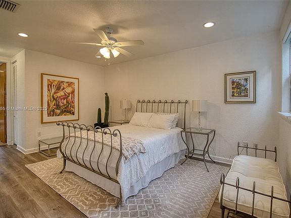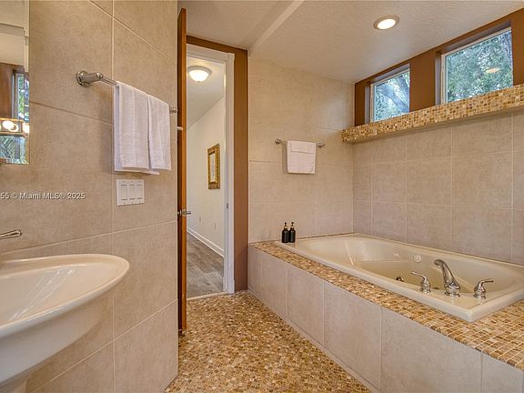 Modern Art Deco inspired home in very lush Coconut Grove lot. The property has a large pool with a covered terrace area, a courtyard, rooftop deck with high privacy wall and large terrace on the second floor. The first floor has living and family areas, a full bath, Snaidero kitchen Cabs., Jenn Air Appliances., DW, wine cooler. W & D in laundry room. Driveway has 4-5 spots with electric plug. The perimeter of the property is walled. 2nd floor has 3 bedrooms. A Master BR with large walk-in closet, huge bathroom with double shower, 2-person spa tub and balcony. Two additional rooms and an open loft area sharing 3rd bathroom.