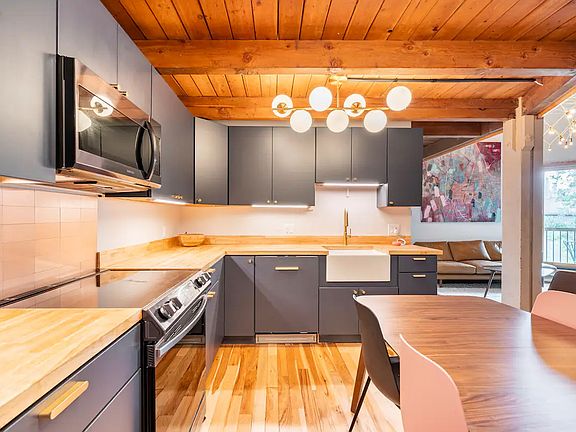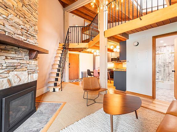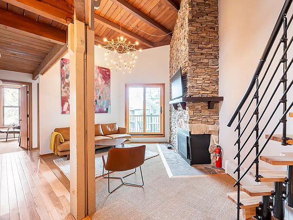 Originally built for the 1976 Olympics, this top floor 2br +loft apartment in the Treehouse complex has the hallmarks of the mid-century era in which it was built - exposed beams, vaulted ceilings and an entirely slate fireplace. With views of Keystone mountain, the unit is centrally located in Silverthorne and close to Arapahoe Basin (20 min), Keystone (15 min), Breckenridge (20 min), Vail (30 min) and Beaver Creek (45 min) Lovingly restored and updated with top-end appliances, hardware, doors, windows and finishes have been added. In each of the two bedrooms is one queen bed while the 3rd bedroom (loft) has a twin bunk bed as well as a convertible couch. This complex is one of the only in Silverthorne that offers guests free access to a hot tub, pool, game room, gym and laundry. The game room has a pool table, air hockey and a few video games. Only available now through December 20th. Rent includes ALL utilities. We would prefer a 6 month lease but are open to shorter term rentals as well with a one month minimum. Absolutely no smoking.