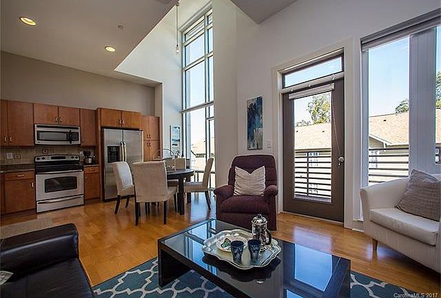 Ultimate South End location, complete with stunning privacy -- Top-floor unit without ANY shared walls or balcony railings is pristine. Jaw-dropping 17-foot windows (yes, 17 feet, not a typo) in upgraded kitchen, sparkling with granite & stainless steel. Private 20x5 walk-out balcony. Tucked a block off South Blvd., walk to dozens of restaurants, coffee shops, breweries, bars and Publix. Easy walk to 2 light-rail stations. Minutes to Uptown. Huge garage with built-in shelving for extra storage..