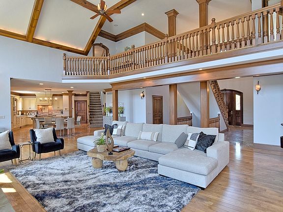 This extraordinary 28-acre estate, crafted by Elpers Brothers Construction, sits atop one of the highest points in Vanderburgh County, just 7 minutes from downtown Evansville. Blending privacy, craftsmanship, and luxury, the property offers a truly unique lifestyle in a serene, park-like setting. From the moment you pass through the masonry entry columns and wind up the tree-lined drive, you’ll know you've arrived somewhere special. The circular drive leads to a stately two-story residence with walk-out lower level, surrounded by manicured grounds, wooded privacy, and panoramic views that stretch more than 20 miles to the east. Inside, the grand foyer features a marble tile floor, elegant staircase with oriental rug treads, and a motorized chandelier. The 20’ great room is a showstopper with beamed ceilings, stone fireplace, and floor-to-ceiling windows overlooking the estate. The open-concept chef’s kitchen includes Fehrenbacher cabinetry, dual granite islands, Subzero and Wolf appliances, pot filler, and a walk-in pantry. Adjacent is a screened porch with slate floors, wood ceiling, and stunning views of the pool and backyard. The main-floor primary suite offers a peaceful retreat with its own fireplace, private balcony with hot tub, and a spa-like bath with slate shower, soaking tub, and dual vanities. A custom walk-in closet includes modular storage and a laundry station. A richly paneled home office with a gas fireplace and built-ins sits nearby. The walk-out lower level features a full theatre with reclining seating, a granite-topped bar, sauna, safe room, kitchenette, and spacious second living area with fireplace. French doors lead directly to the heated saltwater pool (40’ x 20’, 9’ deep) with waterfall, diving board, and pool house with full bath. Additional highlights include a stocked lake with dock, a full concrete basketball court with glass backboards, and a 40x60 heated pole barn with RV-sized doors, fireplace, bathroom, and covered porch. The property also includes Navien tankless water heaters, Alexa-enabled thermostats, Pella wood windows, whole-house generator, irrigation system, central vac, smart security, and extensive outdoor lighting. With a nearby trail connection to Burdette Park and easy access to Louisville, Nashville, St. Louis, and Indianapolis, this is a once-in-a-generation opportunity to own a private, resort-style retreat just minutes from amenities.