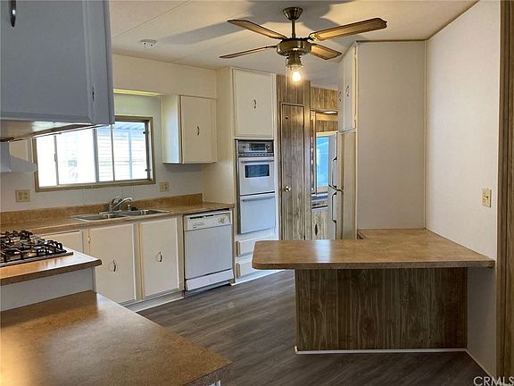 Double-Wide Manufactured Home Recently Upgraded (7/2021) with Laminate Flooring thru-out (Baths and Laundry Rm have Vinyl Flooring), New 5-Burner Stainless Steel Cooktop and Vent Hood, Brushed Nickel Shower Heads, Ceiling Fans in Living Room and Family Room, Freshly Painted Exterior and Freshly Painted Kitchen. This Spacious Home features Built-In Hutch in Dining Room, Built-in Breakfast Nook in Kitchen, Built-In Drawers in both Bedrooms, Interior Individual Laundry Room with Cabinets (Washer and Dryer included), Covered Porch, Covered 2-Car Tandem Carport, Low Maintenance Yard and Large Storage Shed. Sunrise Community amenities include Pool, Spa and Shuffleboard. Close to Freeway and Transportation. 35 Minutes from Palm Springs and 10 minutes from Cabazon Outlet and Casino.