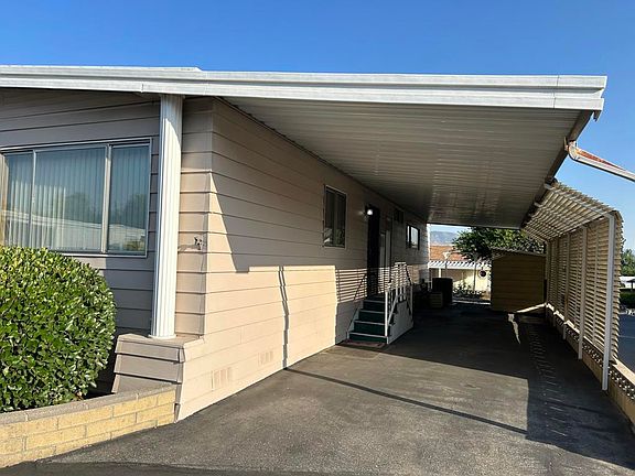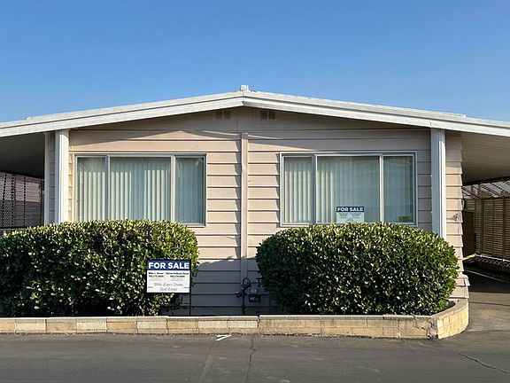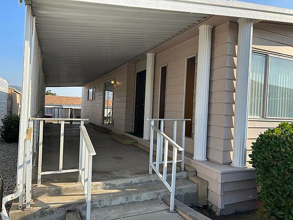Come see this 'very clean retro' double wide mobile home inside the Senior Community of Sunrise Estates. This Two bedroom, Two Bath with Den mobile home is offering 1,344 SF of nice and spacious living space. It features a large living room, with den, formal dining area with built-in cabinet/hutch, lighting fixture for formal dining, antique table and Hutch can be purchased outside escrow. Nice kitchen with small breakfast nook, electric stove top cooker, refrigerator, upright double oven, laundry area with upright washer/dryer. The primary bedroom has large walk-in closet with built-in drawers and large master suite bathroom. Second room nice sized with bathroom across hall. Cooling System was purchased in 2016. Additional conveniences include a carport, storage shed, access to community amenities, club house, pool and various activities taking place throughout the year, making this an ideal place to make into a permanent home, or weekend get-away.