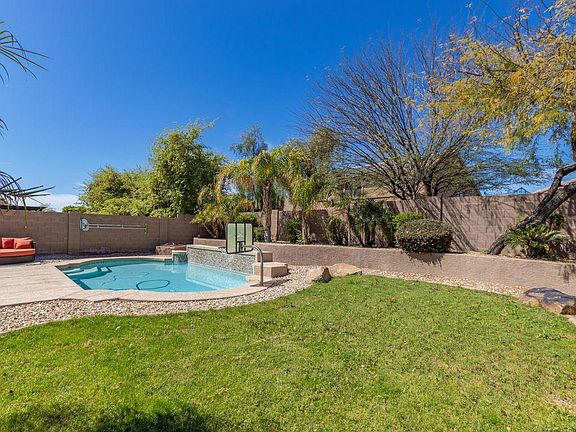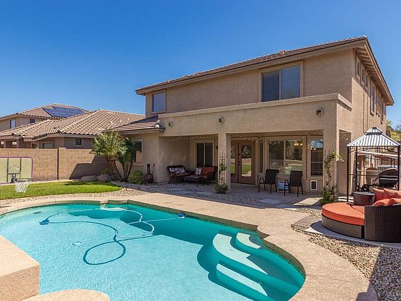 Marvelous home with pool and 3 car garage in highly sought after Windmill Village! Elegant tile in all the right places, Large formal living & dining area, Kitchen boasts lots of warm wood cabinetry, breakfast bar, lots of counter space, big pantry, tiled backsplash, SS/black appliances, and pendant lighting. Full bedroom and bathroom downstairs. Upstairs is a loft area that ideal for a media room or an office. 4 bedrooms upstairs. Big master bathroom showcases dual sinks, roman style bathtub, separate shower and TWO walk-in closets! The covered back patio overlooks the private pristine pool, lush green grass and desert landscaping. This home is perfect for entertaining! Close to great schools, shopping, dining, and entertainment.