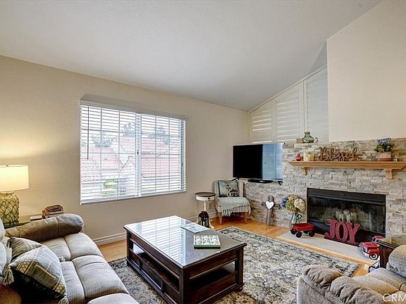 Walk to the lake! This well-maintained carriage unit condo has no one above or below you. It is also an end unit which means you have maximum privacy, light, and views. All on one level, this two bedroom and one full bath (plus additional master vanity) home has vaulted ceilings and gorgeous wood flooring throughout. The kitchen is spacious and opens directly to the dining and living areas. The outside patio is large and private, and you can see the 4th of July fireworks from your balcony! There is a one car garage, plus a full-size driveway. The association maintains a pool, spa and tennis courts in addition to greenbelts all around. Lake Mission Viejo is down the street with beaches, boating paddle boarding, swimming, fishing, concerts, holiday events, and more. This is a beautiful condo in a beautiful community. Award winning schools, and close to restaurants, shops, and more. Complex is not FHA /VA approved.