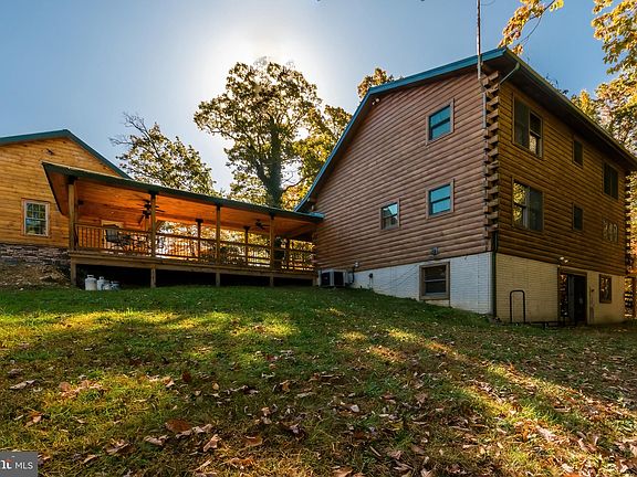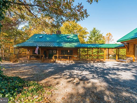 Nestled in wooded 9.5 acres is your dream log home with beautiful mountain views. Remote & Private, yet just 20 minutes from either Winchester, VA or Martinsburg, WV. This Beautiful Home offers an open floor plan with 9" Ceilings, exposed log beams, wood floors and vaulted ceilings. Bright interior with main level bedroom, u shaped kitchen, dining room, living room w/wood burning stove and full bath. Upper level with two bedrooms and full bath. Lower , walk-out level is finished with recreation room w/wood stove, full bath and kitchen. Connected by covered porch is 40x50 detached, finished & climate controlled 3+ car garage w/full bath. Backside of garage has 4th overhead door & 16ft covered area. Many other amenities that needs to be seen to totally appreciate.