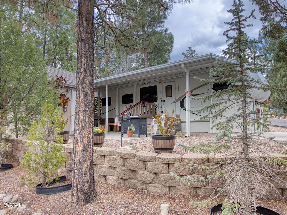 Super Cute! 2 Bed, 1 bath 32 ft home in White Mountain Vacation Village on a corner lot. Beautifully landscaped with a covered patio, BBQ, and even a shed that could be converted to have a washer/dryer, be a workshop, or just leave for additional storage. There is central vacuuming to help you keep tidy, NEW PLUMBING, and the Shower even has a neat tub feature for the littles or fur-babies, or maybe even YOU. :)