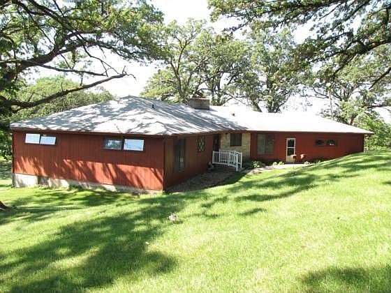 Many angles add interest to this spacious ranch with double garage setting on approx. 3.05 Acres. Great location, just beyond the city limits, and abundant space with endless potential. A wall of windows brings the outside into the spacious living room featuring brick fireplace & cove ceiling. Kitchen features newer laminate flooring & counter-top, center island, planning center and pantry cabinet. Combination laundry/mudroom features cabinetry, sink & adjoining covered patio. Cove ceilings throughout most of the main floor. Due to angles, measurements are approximates. Furnace & central air have been replaced. Well remains for outside watering. Sellers have not used since being hooked up to rural water, so they don't know if pump works or not and it is as is. 32x24 workshop & 12x20 storage building are included.