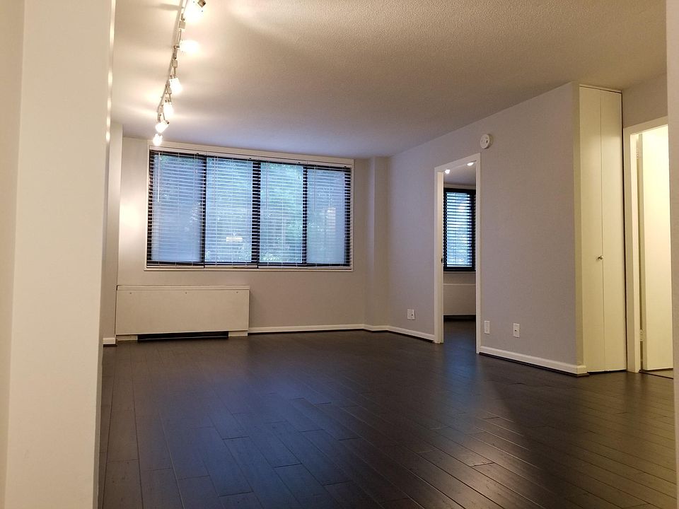 Open concept kitchen/living/dining area with space for a dining table. Contemporary light fixtures and dimmers, dark wood floors throughout, contemporary hardware and high end finishes, large east facing windows. New kitchen with stainless steel appliances including full size side by side fridge with ice/water, dishwasher, microwave and 5-burner gas stove. White quartz counter tops, marble backsplash, garbage disposal, wood cabinets with slow close doors/drawers. Bath with modern vanity and tile and an extra deep soaking tub. Huge walk-in closet with Elfa shelves, plus 2 more spacious closets. The rent includes heat/air conditioning, gas, electricity and water. The apartment is wired for cable and internet. The Carriage House has a 24-hour front desk, live-in building manager, fob entry, laundry, rooftop pool/deck with great view of city, and a renovated lobby. Location: Trader Joe's, CVS, Starbucks, Equinox, Dry Cleaning within 3 blocks 2 blocks to Foggy Bottom Metro (orange, blue lines) 5 blocks to Dupont Circle Metro (red line) 2 blocks to GWU, walking distance to IMF and World Bank Walking distance to both Georgetown and Dupont Circle shops/restaurants Utilities included in rent (Water, Electricity, Gas) Pets on a case by case basis -- the Carriage House limits size of pets to 20lbsNo smokingOne year leaseCredit and background check via Transunion Smartmove service