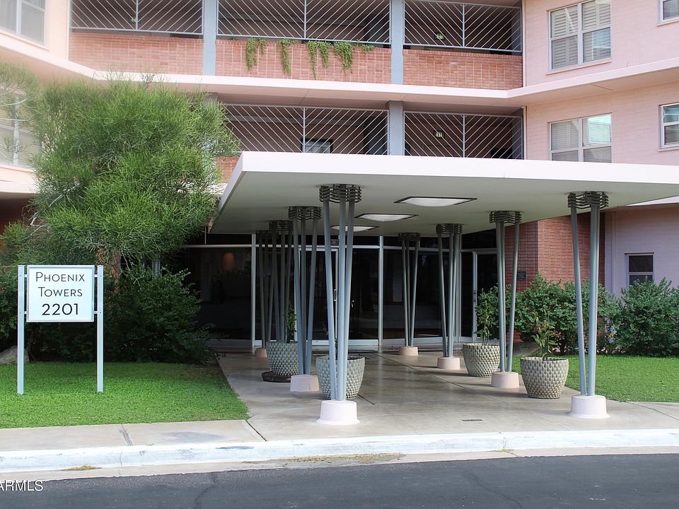 Refreshed with ivory satin paint throughout, along with updated light switches and grounded outlets, this classically beautiful residence awaits you in the iconic Phoenix Towers. Grand-sized rooms with higher ceilings and expansive picture windows define the living spaces, complemented by a spacious balcony, all on the cooler and quieter side of the building. The rooftop terrace offers breathtaking city lights and mountain views, providing an exquisite backdrop for your gatherings. Enjoy resort-style living with a heated saltwater lap pool, complete with a kitchen and barbecue area. Nearby Encanto/Central light rail station affords easy access to downtown, the airport, and ASU. The all inclusive cooperative monthly covers taxes, utilities, maintenance, management, and broadband Internet. The 24/7 door staff ensures security. Two assigned underground parking spaces and a dedicated storage area enhance convenience. Amenities include an exercise room, a fenced dog park and an organic community garden. Timeless design and beauty draw the eye and touch with louvered doors; hardwood for sills, master suite armoire, and the open sided art display shelving between the great room and hallway; as well as a sparkling mirrored mini-bar with illuminated glass shelving. Kitchen has classic Beauty Queen steel cabinetry, a vintage lovers' favorite. Superior building craft of the MCM era is evident with quiet concrete construction; interior walls made of 1" plaster over metal lath and mesh; and fully enclosed wiring. Powerful central plant cooling and heating system, with four vertical stack mains, delivers both cooling and heating modes year round. Building has modernized with dual pane windows, electronic access control and a multi-camera security system.