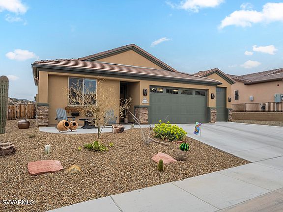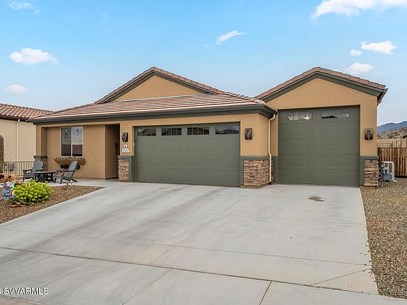 Stunning! Luxury living in sought after Mesquite Hills at the base of beautiful Mingus Mountain. This custom-built home has no detail missed. From the front porch red rock views. Step into whole house plank tile flooring, gourmet kitchen with floating shelves, stainless gas cook top, built in oven/microwave, walk in pantry, pot filler, custom back splash and large island. 3 large bedrooms with master bedroom opening to back patio. Outdoor living is brought inside with oversized patio with full screens, beautiful 15x35 pool heated with hot tub that are very low maintenance. 3 car garage heated and cooled with 10' 3rd bay door that is 36' long and has full RV hook ups and shop area with 1/2 bathroom, storage. Bonus room could be a den/hobby room/game room/office.