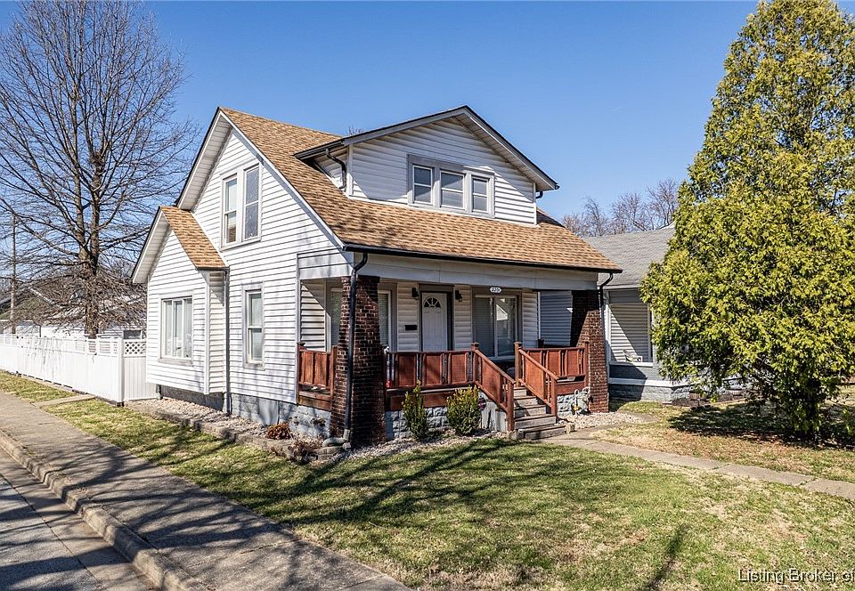 Nestled in the heart of downtown New Albany, this charming bungalow on Reno Avenue is a must-see! Offering 2 bedrooms and 2 full bathrooms, this home boasts hardwood flooring throughout the living room, dining room, and bedrooms. The spacious kitchen has been thoughtfully updated with abundant hickory cabinetry, Corian countertops, a central island for extra prep space, and a full suite of appliances, including a refrigerator, range/oven, dishwasher, hood, and countertop microwave. Enjoy your mornings on the large covered front porch or entertain in the fully fenced backyard with a deck. The waterproofed, unfinished basement provides excellent storage space, while the oversized 24 x 37 detached garage—large enough to fit four cars—offers incredible functionality with its deep bays and oversized doors. Don’t miss this opportunity to own a home with both historic charm and modern updates in a prime location!