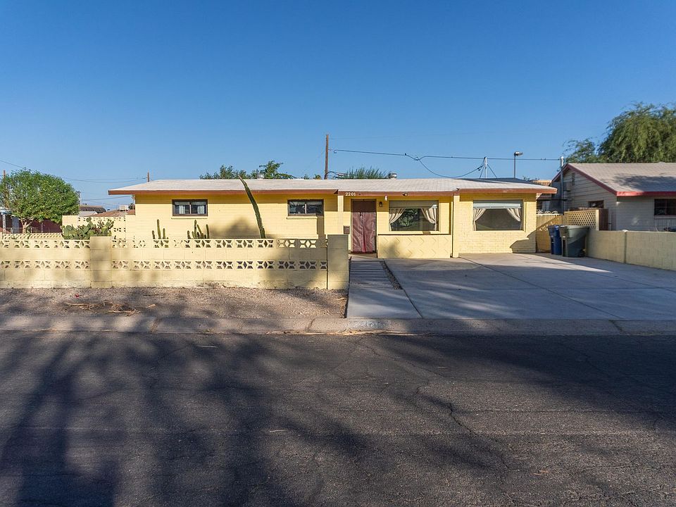 Welcome to this charming, recently remodeled 1953 vintage home that combines trendy updates with timeless character. This 1,275 sq ft gem offers three spacious bedrooms, and two baths, all thoughtfully upgraded with newer vanities and granite countertops. The kitchen is a true highlight with newer cabinets, granite countertops, modern appliances and a cozy breakfast nook. The house also includes a formal dining area and utility room complete with a washer and dryer, adding extra convenience for daily living. Enjoy tile flooring in the main living areas, kitchen, utility room and bathrooms, while each bedroom is refreshed with new, cozy carpet. Situated on a spacious corner lot, this pet-friendly property provides RV access and parking. The backyard is a true oasis, complete with a screened-in covered patio and a relaxing pond surrounded by lush foliage. Conveniently located near Yuma Regional Medical Center, MCAS, shopping centers and with a beautiful park right outside your front door, this home offers a perfect blend of comfort, style and accessibility.