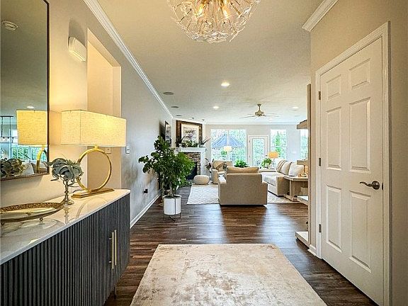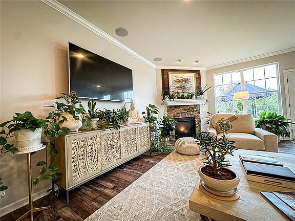 Step into this stunning stone and vinyl ranch and feel instantly at home. This 4-bedroom, 3.5-bath custom-built gem boasts an open floor plan, featuring hardwood floors, crown moldings, and a cozy gas fireplace. The kitchen shines with a large island, stainless steel appliances, pantry, coffee bar, and 1st-floor laundry. Enjoy outdoor living with a cement patio off the bright dining room. The finished lower level feels like a personal spa with a full bath, an oversized tile shower, a wet bar, a 2nd kitchen, and a 2nd fireplace—perfect for relaxing or entertaining. The 3-car garage includes an electric car charging station. This home shows like a model!