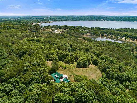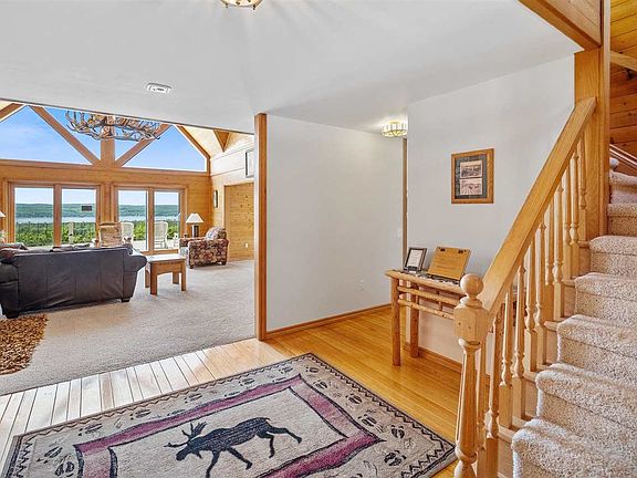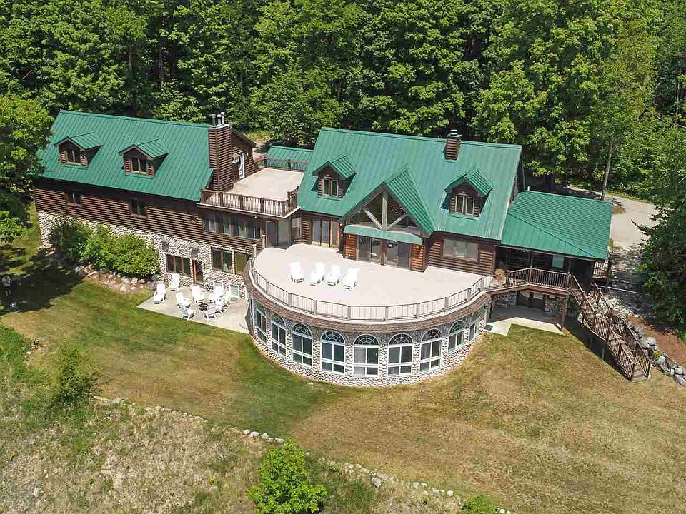 Perched high atop one of the highest hills just outside of Boyne City, in a gated community, is this beautiful retreat on 10 acres. The views are unsurpassed. The deck, overlooking Lake Charlevoix, is large enough to entertain all of your friends and their friends, too. The log home boasts 7 large size bedrooms, most of them suites. This home is a great getaway including indoor kidney shaped pool, hot tub, indoor racquetball court, workout area. The lower level family room with its huge screen TV will be one of the favorite rooms. For the car enthusiast there are 6 oversize spaces to store your treasures. From the large summer kitchen to the guest apartment above the garage, this place will continue to astound you.
