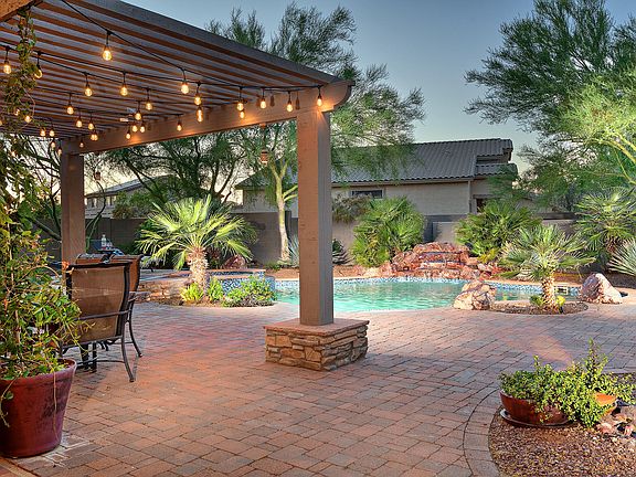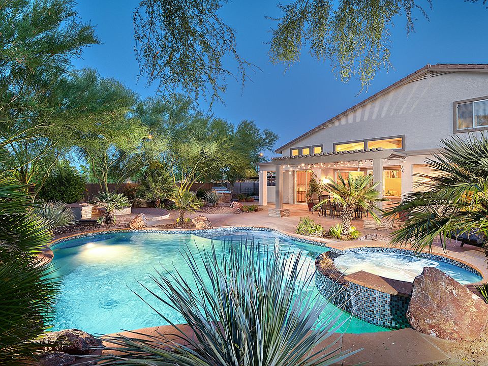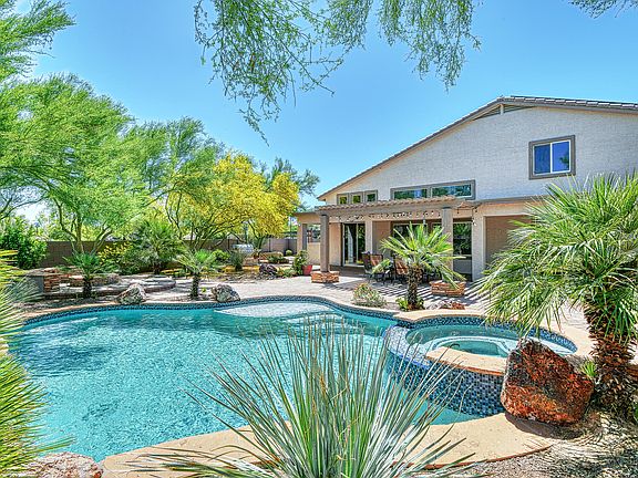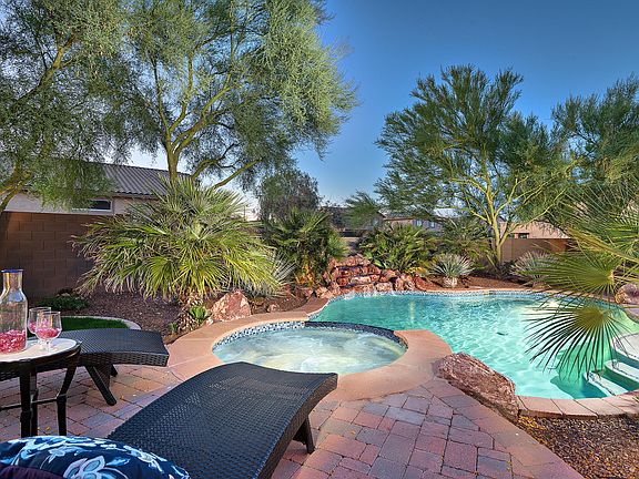 LUXURY WINDMILL VILLAGE HOME ON 1/3 ACRE! Vaulted ceilings, 5-bed/4-bath; master and guest room on main floor; large loft for home theater; granite slab kitchen w/ large island, extended alder cabinets, French induction cooktop and luxury appliances by Dacor, Miele, and Kobe, Blanco sink & faucet, stainless fridge; granite and upgraded fixtures in all baths. Backyard is an entertainer's dream w/ 3 patio areas, pergola, stone fire pit w/ seat, Pebble Tec pool & in-ground hot tub w/ spillway, triple variable speed pumps, large water feature, tumbled pavers, pool & AC equipment walls, vegetable garden, and concrete hobby pad. Newly painted in/out, new upgraded carpet/pad and sealed slate flooring, 14 kW solar array, water softener/RO, solar tube skylights... too many upgrades to list! This property includes a 14.4 kW solar array that generates over 25,000 kilowatt hours per year. The average utility bill for this house is $77 per month. This solar lease saves the owner approximately $800 per year after paying the lease. If the solar array is under warranty, all warranties transfer to the new owner. Great HOA that keeps community shining and performs security & parking patrol! Listing agent is married to seller.