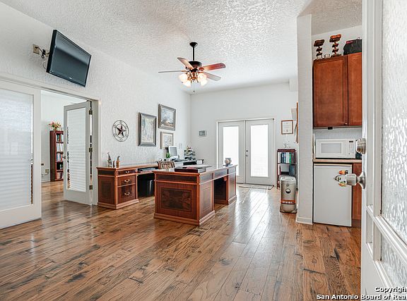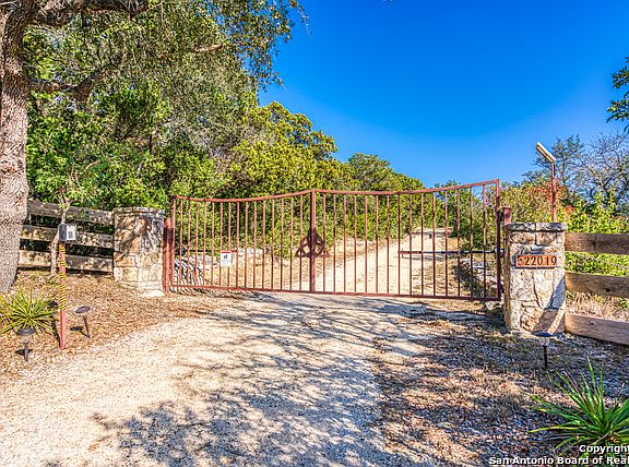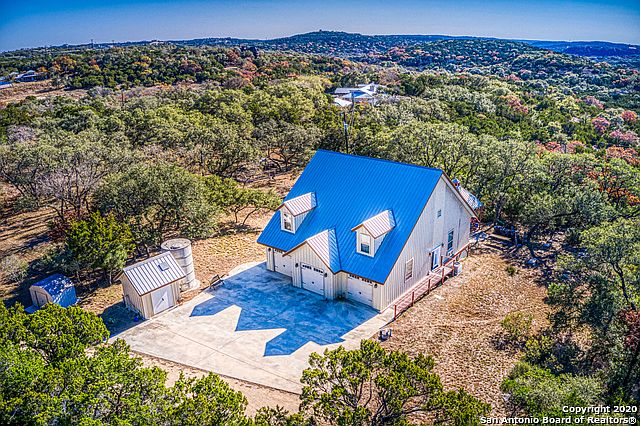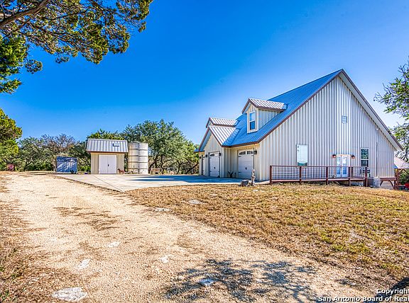 Desirable Scenic Loop! A rare opportunity! This unique property has 5.313 acres and no restrictions. The barndominium is set up for office downstairs, and apartment upstairs with two bedrooms and full bathroom. The kitchen has stainless steel appliances and granite countertops. Refrigerator stays. Bathroom has glass bowl sinks and large walk-in shower. Downstairs has two office areas with full bathroom and kitchenette. Ideal property for a family compound for other home or homes to be built. Gazebo with outdoor kitchen and pizza oven is ideal for entertaining. Community gate plus private gate to property. Metal roof, solar panels, water tower, two water softeners, tankless water heater, generator, shed, chicken coop, too much to list! 2479 sq ft per appraisal/800 per BCAD. No city taxes! Tax rate is 2.15%! Close to Grey Forest, Helotes, Boerne, Leon Springs, UTSA, The Rim, and La Cantera. See additional information.