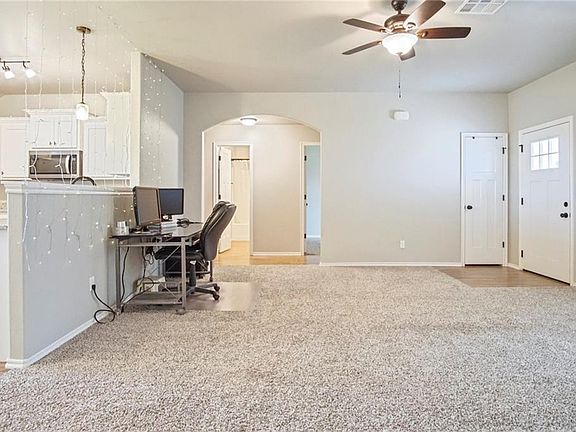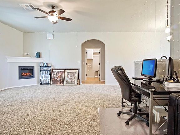 Imagine how peaceful it would be to come home after a long work day to almost an acre lot plus those beautiful Oklahoma sunsets with a wide open view right out your back door every night! This all brick home is like new and has been well kept inside. There's an open layout with the master on one side and two spare bedrooms on the other, two full size bathrooms with tub/shower combos, a double sink vanity in the master bathroom, spacious master closet, hallway storage options, covered front porch and back patio area!