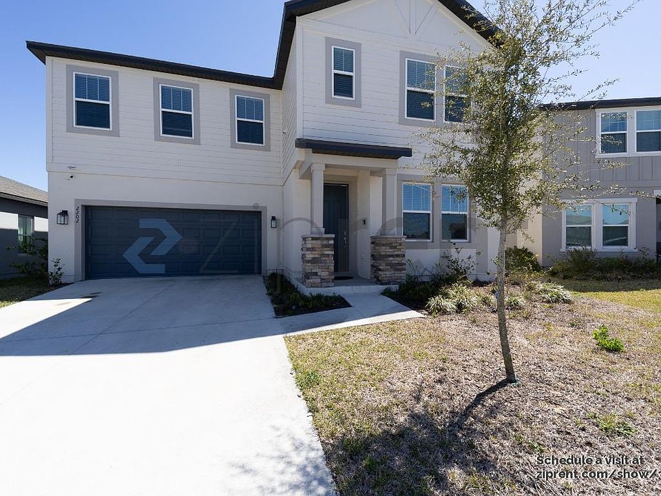 Welcome to your dream home at 2202 Derwent Dr, Davenport, FL 33896. This stunning two-story residence offers a perfect blend of modern elegance and comfort. As you approach the property, you're greeted by a well-maintained front yard and a spacious two-car garage. The inviting entrance features charming stone accents, setting the tone for the exquisite interior. Inside, the home boasts an open-concept layout with sleek hardwood flooring that flows seamlessly throughout the main living areas. The bright and airy living room, enhanced by high ceilings and large windows, provides a perfect space for relaxation and entertainment.