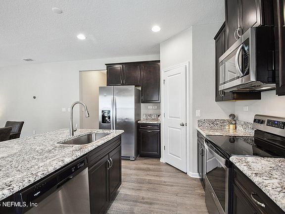 This beautiful home, built in 2019, is perfectly situated on the edge of the sought-after Eagle Harbor community, offering a peaceful waterfront setting while still enjoying full access to the exceptional amenities this master-planned neighborhood is known for. From the gleaming wood floors to the long water views, you will not be disappointed. Easy living with open kitchen to living area, granite counters & expresso color cabinets. Primary bedroom & luxurious bath downstairs overlooking the water, 3 bedrooms upstairs with one having an ensuite bath. Enjoy your morning cup of coffee or an end of the day beverage while relaxing on your covered screen lanai that extends the living space outdoors. Top-rated Clay County schools make this location ideal for families seeking quality education in a friendly, established neighborhood. Its prime location near shopping, dining, and major highways, you'll have the perfect balance of peaceful suburban living and everyday convenience.