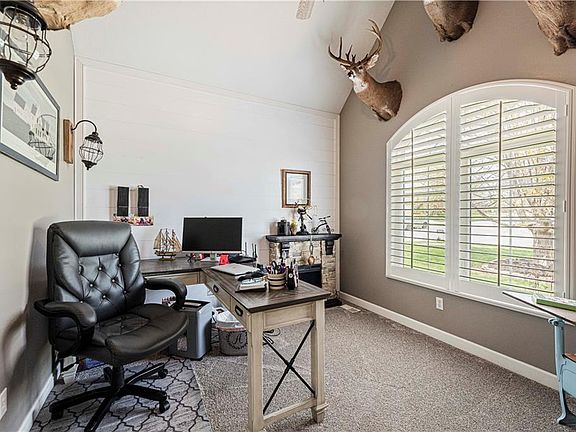 Welcome to 2202 Greenfield Court, a spacious and well-maintained 1.5-story home nestled on a beautiful corner lot in The Meadows at Greenfield, within the sought-after Kearney School District. This 4-bedroom, 3.1-bath home offers an ideal layout with a front office, formal dining room, and an open-concept kitchen, dining area, and living room featuring vaulted ceilings and a cozy fireplace. The kitchen includes a large island, custom cabinetry, and walks out to a back deck - perfect for entertaining. The main-floor primary suite boasts a luxurious en-suite with double vanities, whirlpool tub, separate shower, and walk-in closet, plus convenient main-floor laundry and a half bath nearby. Upstairs, you'll find three more spacious bedrooms - each with walk-in closets - along with two full bathrooms (including one en-suite) and a generous loft space. The walkout basement is stubbed for a full bath and offers potential for a fifth bedroom, additional living area, storage, and even a tornado shelter, with two brand-new windows included for future install. This home combines function, comfort, and flexibility in one of Kearney's most desirable neighborhoods.