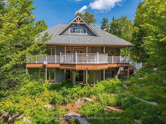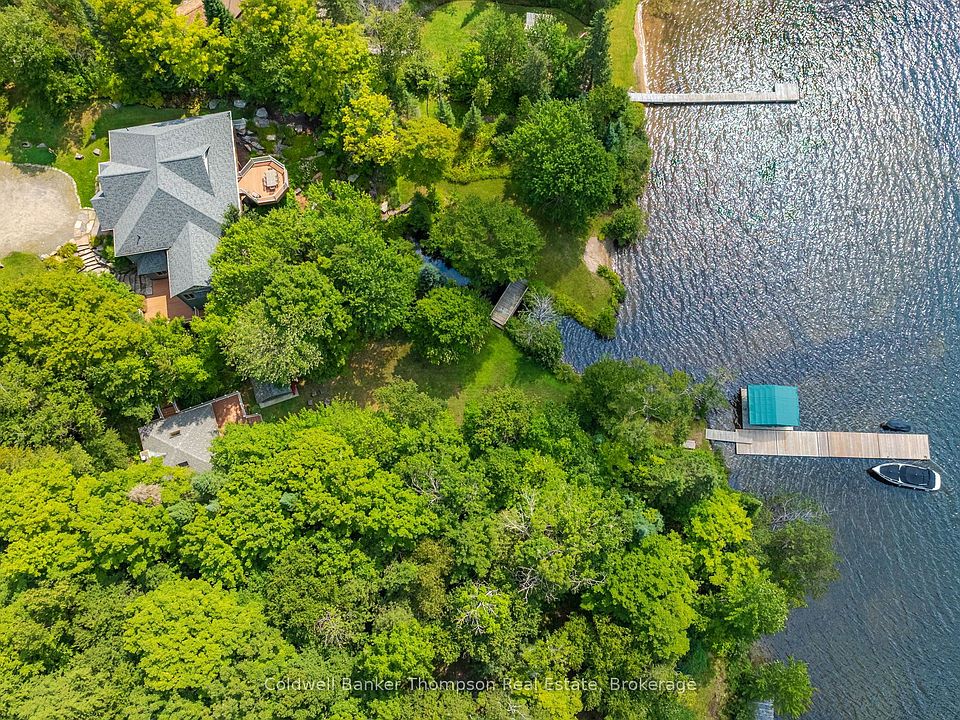 Discover the ultimate Muskoka living at this extraordinary lakefront property, set on 1.36 acres with 180 feet of sandy shoreline, and south west exposure on beautiful Peninsula Lake. With a private dock, sandy beach, and miles of boating through the sought after four lake chain. Ideally located just minutes from Huntsvilles premier golf courses and ski hill, and only 10 minutes to town, it blends seclusion with convenience. The moment you arrive, the extensive landscaping and natural beauty set the tone. A stream winds through the landscaped grounds, crossed by a charming bridge that leads to a lakeside entertaining room unlike any other. This space opens to the outdoors at the touch of a button, offering panoramic lake views, warm wood walls and ceilings, featuring a wood burning fireplace perfect for hosting unforgettable evenings by the water. Extensive decking around the home, offering multiple gathering areas for morning coffee, afternoon sun, or sunset cocktails. Inside, Muskoka charm meets timeless comfort. The main living room soars with cathedral ceilings, wood beams, and knotty pine flooring, anchored by a dramatic river rock fireplace. The custom kitchen blends rustic elegance with functionality, featuring custom cabinetry, granite counter top, a stunning island, and a walk-in pantry. The sunken great room offers a cozy retreat with a granite slab & gas fireplace focal point. On the lower level, several bedrooms provide comfortable accommodations for guests, a spacious family/games room with a rustic stone bar and second river rock fireplace creating the perfect space for year round entertaining. Every element, inside and out, has been thoughtfully crafted to showcase the natural beauty of Muskoka while offering the amenities and space for modern lakefront living. To complete the package, this property is offered fully furnished inside and out, and includes a boat and jet ski for the ultimate turn-key cottage experience.