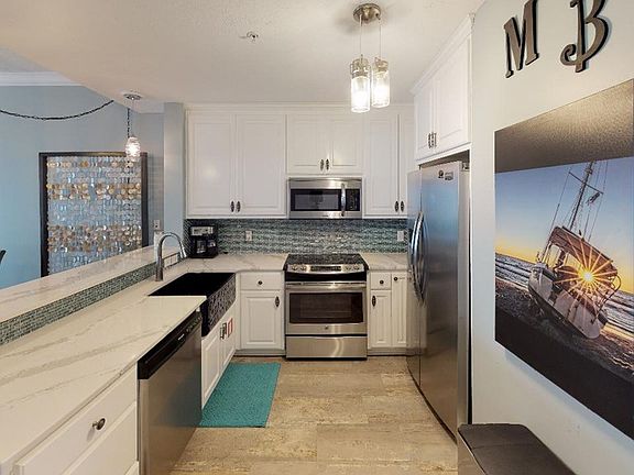 Classic 2 bedroom/2 bath unit is right across the street from the beautiful Gulf of Mexico. You will love the balcony views of the sunset over the water while you sip your favorite cocktail and relax! Completely remodeled & furnished since the storm, each bedroom has an en suite and the master has a garden tub, walk in shower and double vanities. Kitchen has stainless steel appliances, solid surface counter tops, convenient breakfast bar, convenient pantry and a beautiful farmhouse sink! Open concept and spacious design to accommodate your family and friends. You will never get tired of the water view from the spacious window wall in the living area! This unit comes with additional storage and there's a private heated pool on the 2nd floor of the complex with restroom area and a Sauna, & Hot Tub. With all the amenities that you will love.