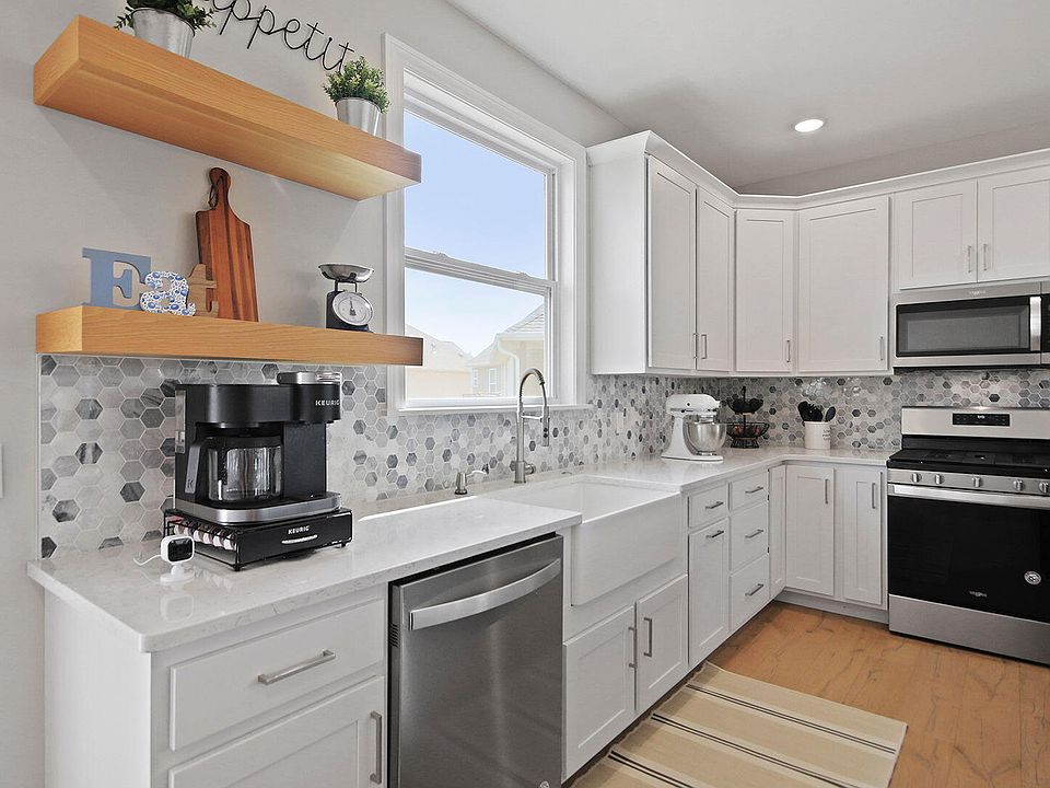Covered front porchQuartz countersMain-level primary suitePrivate bathsSpa-like bathSpacious family roomGas range