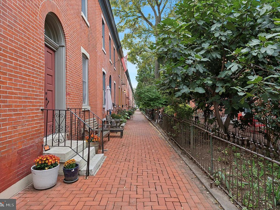 Don't miss this exceptional 25-foot-wide brick-front townhome with 2 bedrooms + DEN on a pedestrian-only garden block in Graduate Hospital. Tasteful and timeless decisions were made throughout the design to complement the historical charm of this spectacular home. Enter from the brick sidewalk into the center entry hall with a unique (open on both sides) staircase featuring an arch and decorative cornices. To the left, there is a living room area featuring original red pine floors (which continue throughout the home), a decorative mantel, and French doors to the back patio. The patio offers a secure place to store bicycles and create a lovely oasis with planters and a bistro set. Opposite the living area is a spacious dining room that flows directly into the custom kitchen, making entertaining a breeze. The stylish kitchen features marble counters and backsplash, a large porcelain farmhouse sink, shaker-style cabinetry, and stainless steel appliances. A convenient powder room with a space-saving wall-mounted sink and marble tile accent completes the main level. At the top of the staircase is a flex space, perfect for a home office or den with an antique storage closet. This area leads into the primary bedroom with a ceiling fan, two closets and two north facing widows overlooking Madison Square. The other bedroom features a built-in desk and storage bench in the window bay along with a closet which is conveniently plumbed for washer and dryer. The gorgeous marble bath was completely renovated and features an oversized soaking tub with rain shower, pedestal sink, heated floors with tasteful hex tile and tons of storage space. The freshly painted basement houses all mechanicals, including the laundry area with newer front-loading washer and dryer, and leaves plenty of room for storage. Bonus updates include a new roof in 2024, a whole-house water filter, and brick repointing. From this location, you can easily access Fitler and Rittenhouse Squares, the Schuylkill River Trail and Center City, plus you’re only steps from local favorites like Ultimo Coffee, Sidecar, Los Camaradas, and Ants Pants Café. There's playgrounds and grocery stores all within reach, plus the fabulous Marian Anderson Neighborhood Academy is less than two block away! Schedule your private showing today!